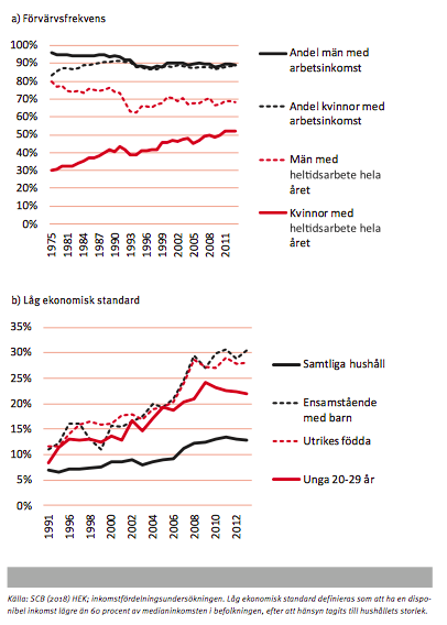 Stigande ojämlikhet har präglat de flesta rika välfärdsstaterna men sedan 1980-talet har den ökat mer i Sverige än i något annat OECD-land. En del av förklaringen är just att de med lägst inkomster inte fått hänga med, utan släpat efter den generella ökningen av levnadsstandarden. Omprioriteringar i svensk välfärdspolitik har bidragit till den växande ojämlikheten.