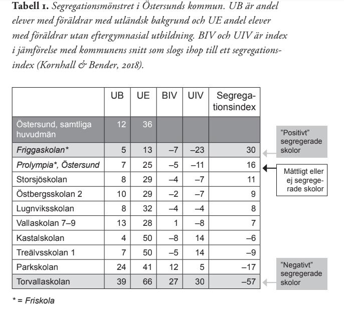 Det vi kan se är att två privata skolor (markerade med asterisk i tabellen) har den högsta andelen svenskfödda och/eller välutbildade föräldrar medan de skolor med fler barn från invandrade och/eller lågutbildades barn alla är kommunala (de utan asterisk i tabellen). Det vi ser är i praktiken ett kommunalt parallellskolesystem (för närmare beskrivning av tabellen hänvisar vi till Kornhall & Bender, 2018).