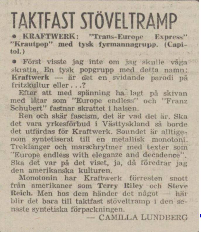 En av de få etablerade svenska musikredaktioner som tidigt förstod Kraftwerks storhet var tidningen Schlager. De satte gruppen på omslaget långt före någon annan, och när rockhistoriens första 30 år skulle summeras 1984 fick gruppen en egen artikel. Det är visserligen inte självklart, men på sätt och vis ändå logiskt att en tidskrift som härstammade ur proggrörelsen kunde uppskatta en grupp som också vuxit ur progressiv mylla. Jag minns speciellt hur tidningens återkommande seriesida en gång parodierade svenska recensenters rädsla för Kraftwerk. På ett kollo där framtidens musikskribenter skulle fostras upptäcks en parvel som lyssnar på The Man Machine under täcket. Som straff får han lova att aldrig mer lyssna på trummaskiner. (Det bör dock i sammanhanget nämnas att Schlagers recensent dömde ut Depeche Mode efter deras andra album…)