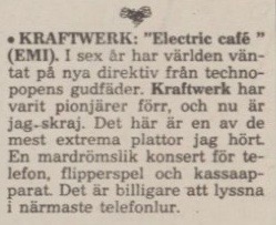 1986 kommer till slut deras album, nu omdöpt till Electric Café. Det är en besvikelse. Förstås. Fem års väntan går att inte att leva upp till. Speciellt i en genre som utvecklats explosionsartat, just tack vare Kraftwerk. Expressen sågar för övrigt även denna platta, men recensenten Måns Ivarsson gör det närmast slentrianmässigt: