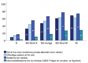 Det mer anmärkningsvärda är emellertid att de väljare som lämnat Socialdemokraterna för SD tenderar att stå betydligt längre till höger i socioekonomiska frågor än de som fortfarande röstar på Socialdemokraterna (figur 1 nedan). De är mycket mer positiva till sänkta skatter och vinstdrivna privata alternativ inom vården, och mer benägna att tycka att den offentliga sektorn är för stor.