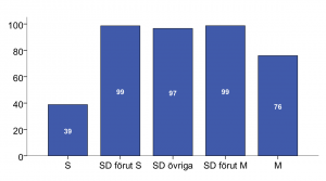 Samtidigt verkar risken för ytterligare väljarflykt från Socialdemokraterna till SD vara liten: endast 6 procent av S-väljarna uppger att de har SD som andrahandsalternativ (vilket kan jämföras med att hela 38 procent av moderatväljarna uppger SD som andrahandsval). Detta ligger i linje med den relativt liberala och toleranta inställning till invandring och invandrare som de flesta socialdemokratiska väljare uppvisar i figurerna 2-4 ovan.