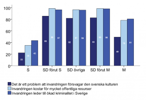 Inte heller när det gäller benägenheten att föredra infödda svenskar som grannar (som i tidigare forskning har använts som ett mått på etnocentrism), att inte vilja få en invandrare som chef eller ingift i familjen (som tidigare har använts som en indikation på xenofobi) eller tendensen att instämma i påståendet att visa folkslag är mer intelligenta än andra, skiljer sig väljare som har lämnat Socialdemokraterna för SD i betydande grad från andra SD-väljare. Däremot är skillnaden mellan SD-väljarna och de som röstar på Socialdemokraterna – eller för den del Moderaterna – iögonfallande.