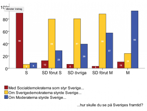 Den generella bilden är att de väljare som har lämnat Socialdemokraterna för SD inte skiljer sig från övriga SD-väljare, medan de avviker kraftigt från de S-väljare som fortfarande röstar på Socialdemokraterna. Ett undantag från den bilden rör attityder till den socioekonomiska politiken, där SD-väljare som tidigare röstat på Socialdemokraterna står något till vänster om övriga SD-väljare.