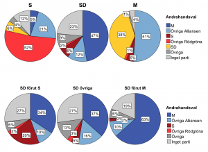 Om vi tittar närmare på hur andrahandspreferenserna är fördelade bland S-väljarna ser vi också att en majoritet av dem – 58 procent – nämner partier som står för en mer öppen och liberal migrationspolitik: 35 procent nämner Vänsterpartiet, 10 procent Miljöpartiet, 10 procent Centerpartiet och närmare 3 procent Feministiskt initiativ). Man kan spekulera i att delar av dessa väljare reagerar negativt på Socialdemokraternas migrationspolitiska kursomläggning och kan komma att överväga partibyte.