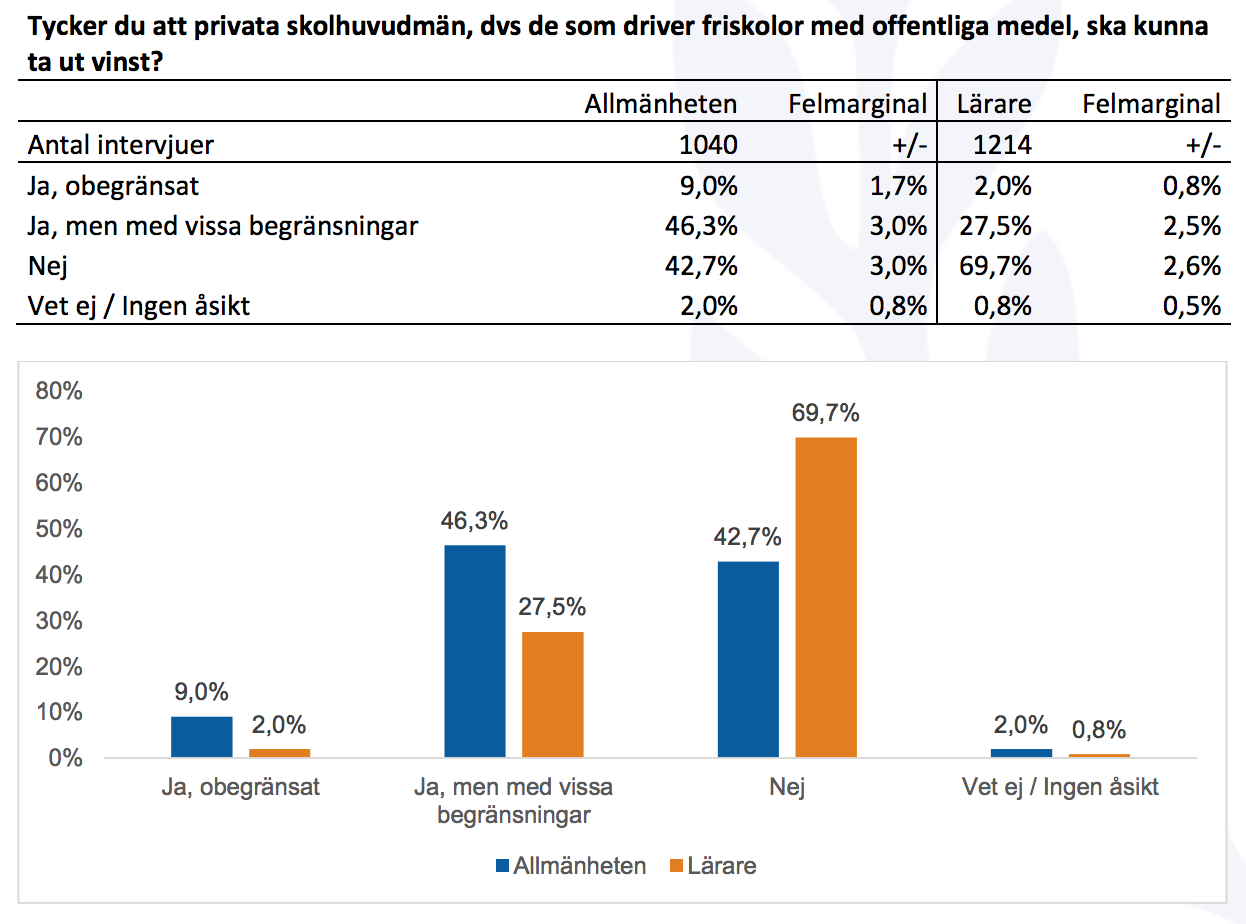 En absolut majoritet av alla de tillfrågade tycker att dagens system är dåligt. 9 procent av de tillfrågade väljarna och 2 procent av lärarna i undersökningen svarar ja på frågan om friskolorna ska obegränsat ska kunna plocka ut vinst.