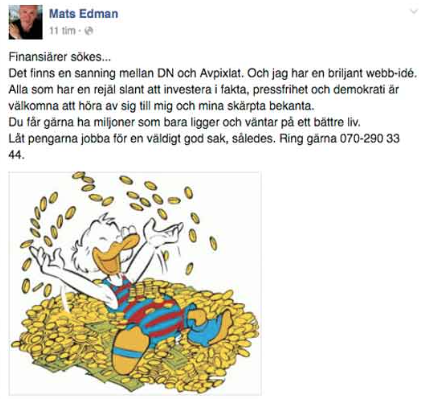 I en statusuppdatering på Facebook efterlyste han »alla som har en rejäl slant att investera i pressfrihet och demokrati«. Potentiella finansiärer får »gärna ha miljoner som bara ligger och väntar på ett bättre liv«, skrev han.