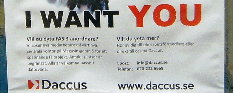 ”I want you”. En onkel Sam pekandes mot betraktaren pryder affischen som är uppsatt vid en busstation i Göteborg. Annonsen står företaget Daccus för, en ny aktör på jakt efter personer i fas 3. Den aggressiva tonen i marknadsföringen har stuckit i ögonen på andra fas 3-deltagare.