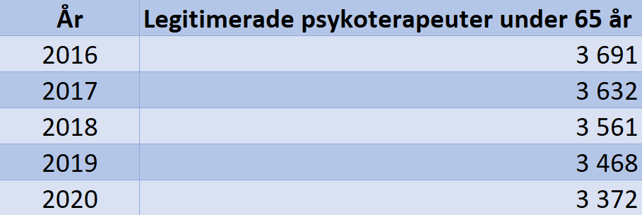 Samtidigt visar nya siffror från Socialstyrelsen att antalet legitimerade psykoterapeuter i arbetsför ålder fortsätter att sjunka. År 2016 fanns cirka 3 700 legitimerade psykoterapeuter under 65 år. Förra året hade antalet sjunkit till cirka 3 370.