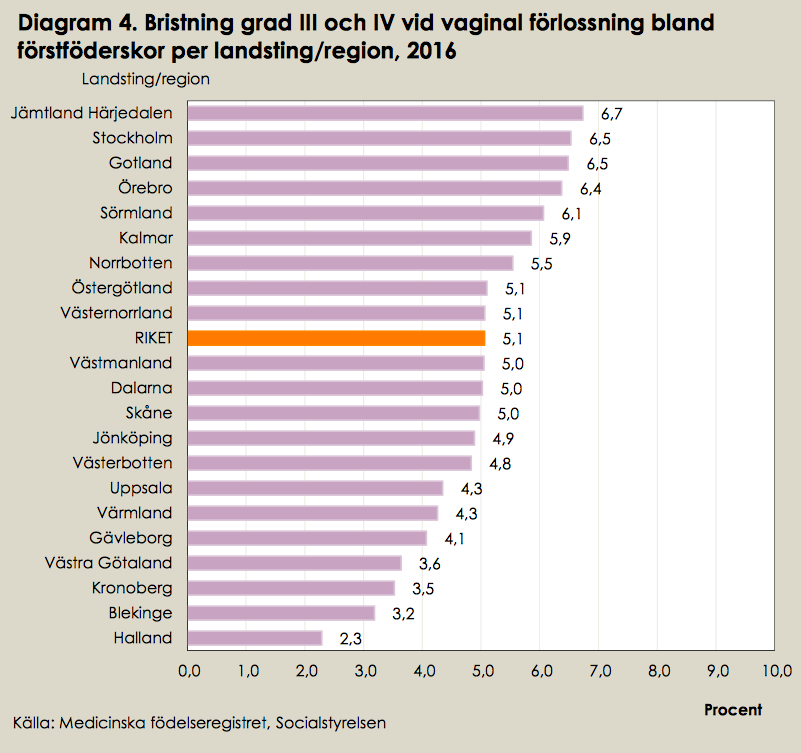förlossningsvård Bristningar av tredje eller fjärde graden till följd av förlossning minskar i Sverige sedan 2010. Men skillnaderna är stora mellan landstingen. Halland har lägst andel förlossningsskador.