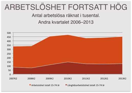 När regeringen tillträdde låg arbetslösheten på drygt sex procent. Andra kvartalet 2013 var siffran 8,7 procent, eller drygt 450 000 personer.