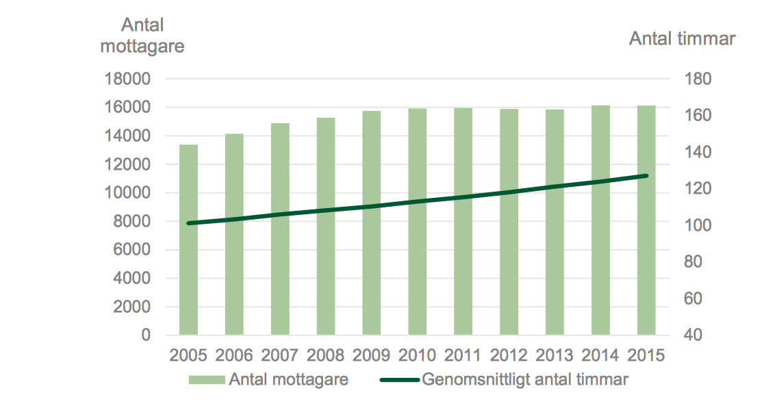 Antal assistansmottagare och genomsnittligt antal beviljade timmar per vecka 2005–2015.