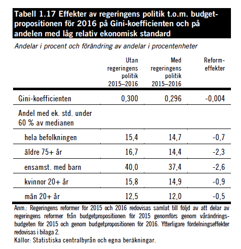 Även budgetens effekt på gini-koefficienten, som visar på den samlande inkomstfördelningen hos en befolkning, är bättre i jämförelse med vårpropositionen. I och med höstens budget minskar de samlade inkomstskillnaderna från 0,300 till 0,296 med regeringens politik (sid 2). I vårpropositionen skulle den ha minskat från 0,305 till 0,306.