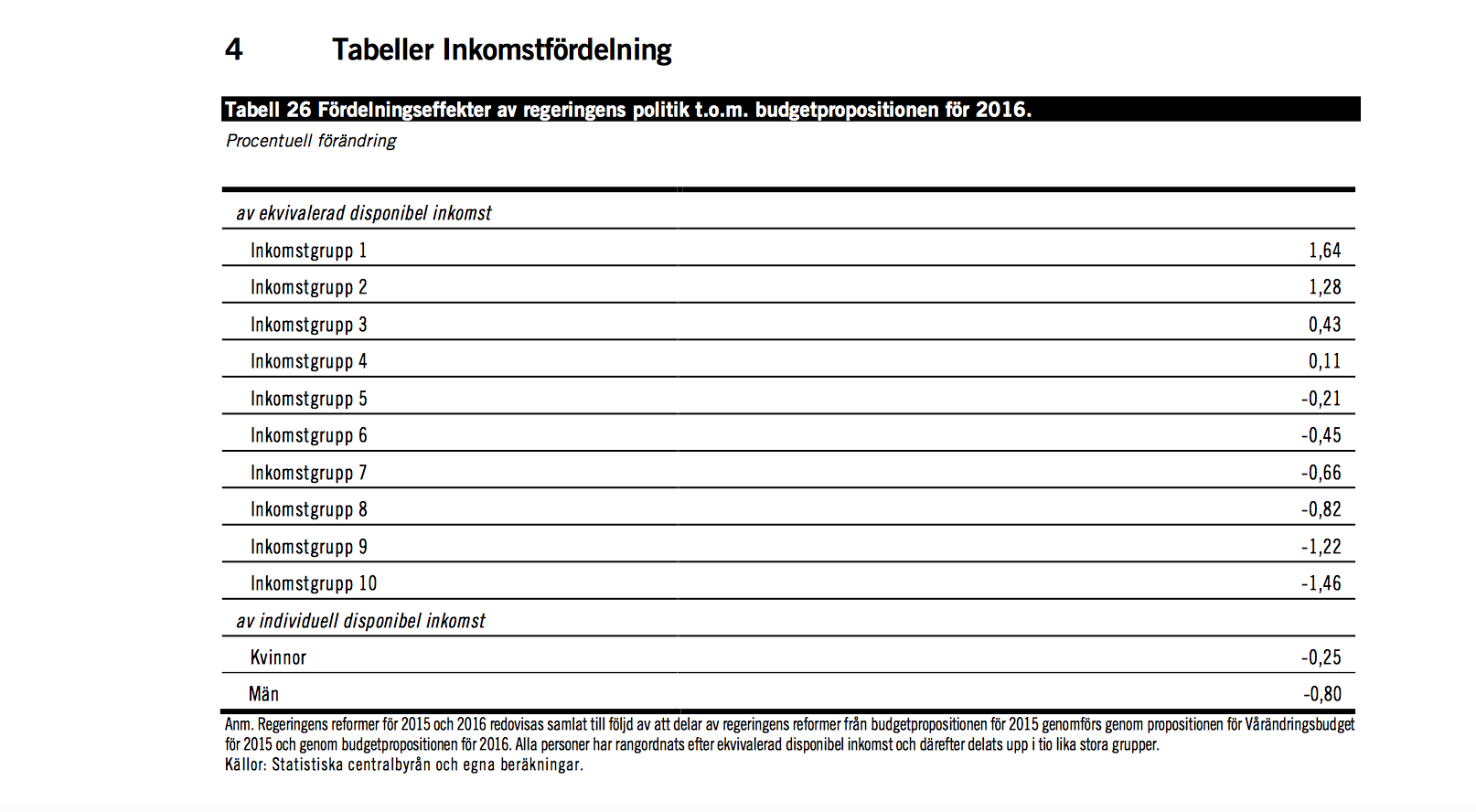 Tabellen visar att de fattigaste 40 procenten tjänar mest på regeringens budget. På grund av att politiska åtgärder som främst gynnat män, exempelvis jobbskatteavdraget, trappas av, förlorar män mer än kvinnor på budgeten.