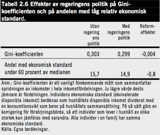 Sammantaget beräknas regeringens budget bidra till en svag minskning av inkomstskillnaderna i landet, mätt med Gini-koefficienten. Med regeringens politik landar den på 0,299, utan den hade Giniko-koefficienten legat på 0,303.