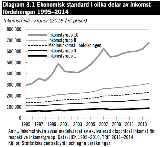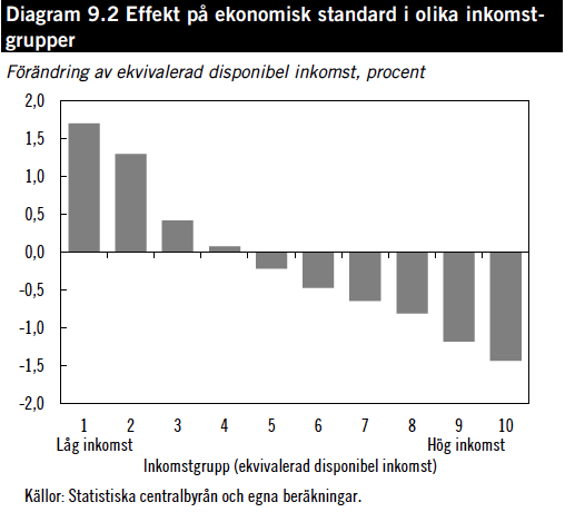 För de 20 fattigaste procenten av befolkningen ökar den ekonomiska standarden med 1,7 respektive 1,3 procent. Detta medan den rikaste tiondelens ekonomiska standard sjunker med 1,2 procent. Detta förklaras bland annat av avtrappat jobbskatteavdrag, som främst gynnat män.