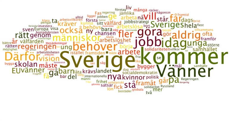 Dagens Arena har tagit del av Löfvens talmanus och gjort ett ordmoln av innehållet. Jobb, unga och Sverige är några av de nyckelord som framkommer särskilt tydligt i S-ledarens tal.