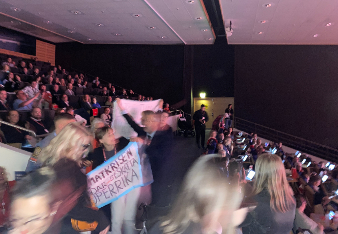 Precis innan hon började tala avbröts Magdalena Andersson av unga klimataktivister med banderoller. På en av dem stod ”Klimatkrisen dödar – beskatta superrika”. En av aktivisterna ropade att Magdalena Andersson beter sig som att det inte existerar någon klimatkris. ”Var är ditt ledarskap?”, ropade aktivisten. De fördes snabbt ut ur plenum.