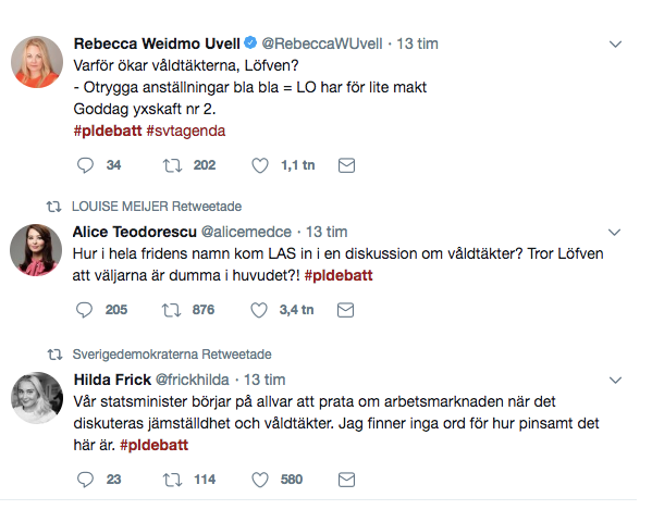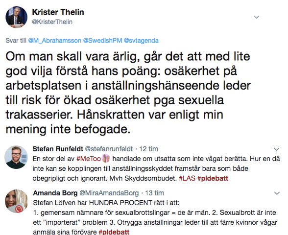 »Nu pratar vi om sexuella övergrepp och våldtäkter, och det är ett annat problem, som inte så mycket hänger ihop med villkoren på arbetsmarknaden« fortsatte Åkesson och fick då till svar av Stefan Löfven: »Har du inte följt metoo-debatten?«