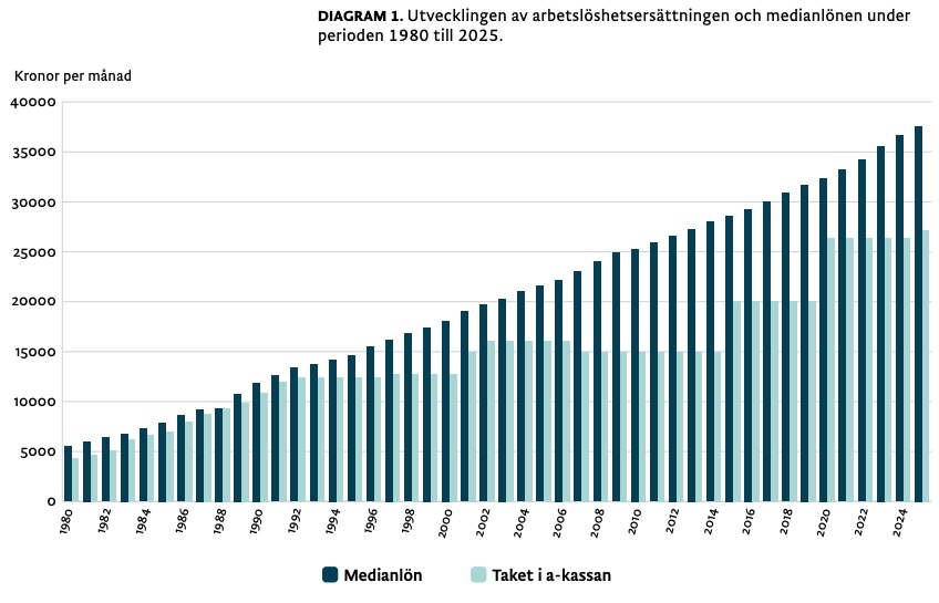 Att a-kassan urholkats har tidigare konstaterats av TCO i ett antal rapporter. Mellan 2020 och 2025 har taket i a-kassan höjts med 3 procent samtidigt som medianlönerna ökat med cirka 16 procent.