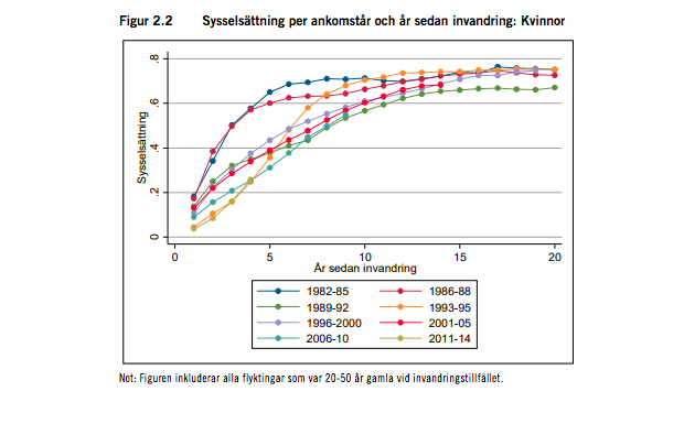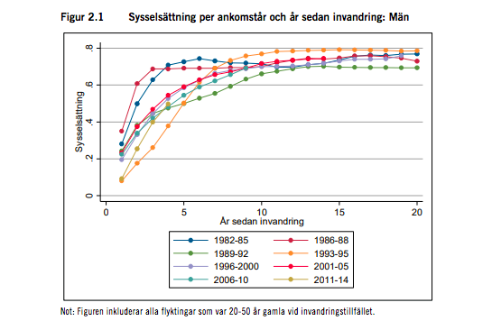 Hans rapport visar dock att det de senaste 20 åren inte blivit svårare för utlandsfödda att få jobb – men det tar 15 till 20 år.