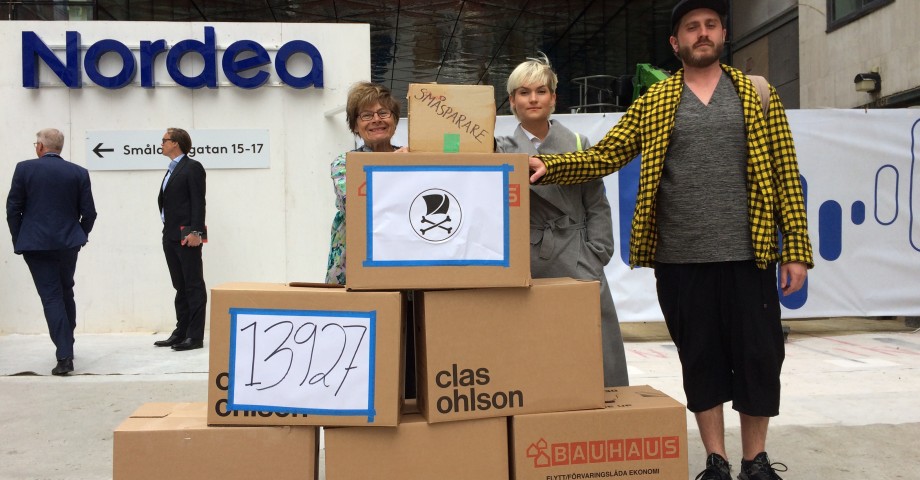 BANKAVGIFT 14 000 personer har skrivit på en protestlista mot Nordeas planer på att flytta sitt huvudsäte från Sverige. Kampanjen genomförs av organisationen Skiftet som i dag manifesterade utanför Nordeas huvudkontor i Stockholm.