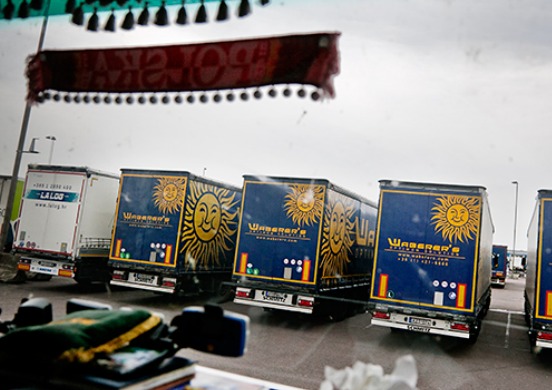 På en inhägnad parkeringsplats i Trelleborgs hamn samlas utländska lastbilschaufförer under helgerna. En del för att på måndagen ta färjan över till kontinenten. Där plockar de upp ny last i Polen, kör vidare till Spanien för att sedan återvända till Linköping. Andra står parkerade här i en osäker väntan på nya uppdrag från en arbetsgivare någonstans i Sverige.
