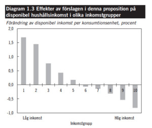 De sammantagna effekterna av regeringens budgetsförslag gynnar främst ekonomiskt utsatta hushåll i den nedre delen av inkomstskalan. Därmed bidrar förslagen till att minska inkomstskillnaderna mellan olika klasser, samt mellan män och kvinnor.