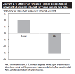 Sammantaget kommer alltså inkomsterna att öka för låginkomsttagare och minska för höginkomsttagare om förslagen blir verklighet. Ungefär samma profil får fördelningen mellan män och kvinnor. Kvinnors ekonomi förstärks medan män får betala mer till statskassan: