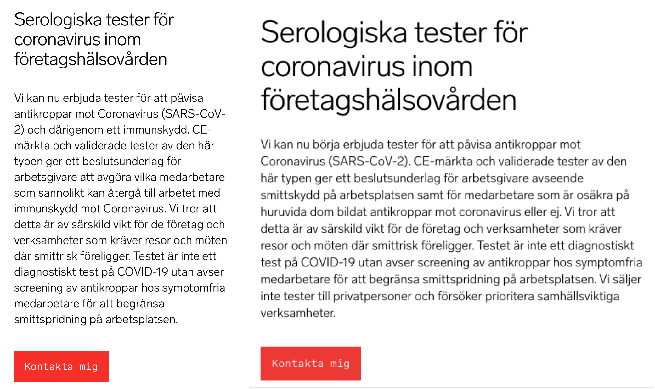 På torsdagsförmiddagen kommer en tredje version av informationstexten. Nu har de lagt till en rad om immunitet: »Testet är inte ett diagnostiskt test på COVID-19 utan avser screening av antikroppar hos symptomfria medarbetare för att begränsa smittspridning på arbetsplatsen. I dagsläget återstår många frågor att besvara forskningsmässigt avseende immunitet vid påvisade antikroppar. Vi säljer inte tester till privatpersoner«.