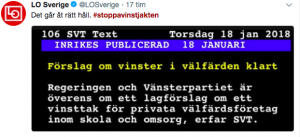 Efter valet 2014 villkorade Vänsterpartiet sitt stöd för regeringens budgetar med att regeringen skulle lägga fram ett förslag om vinster i välfärden före valet i år.