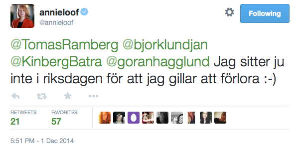 Vad detta spelar för praktisk roll om de inte nu är beredda att regera med budgeten framgår inte. Men det är kul att vinna, tycker Annie Lööf.