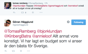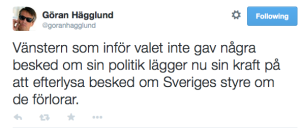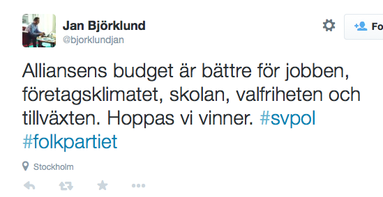 I gårdagens tweet (nummer tio i ordningen) hoppades Jan Björklund att alliansen “vinner”.