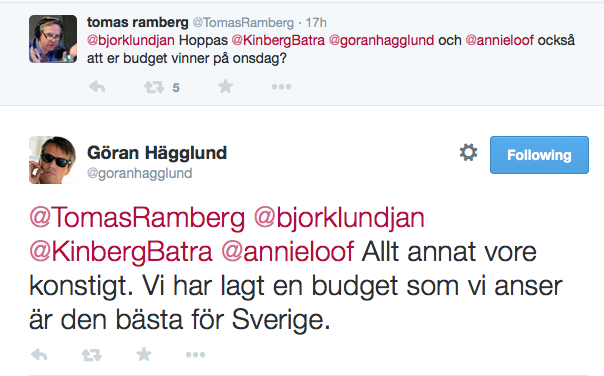 – Om regeringen inte får igenom sin budgetproposition i Sveriges riksdag, då är det regeringen som har problem. Stefan Löfven har åtagit sig att regera och styra landet, och då ingår att få igenom sin regeringsproposition, säger hon.”