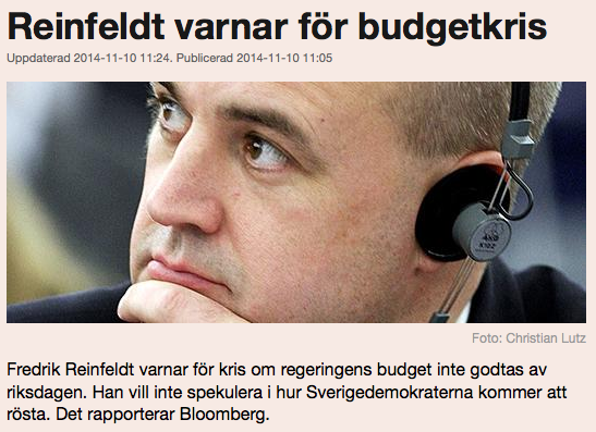 “Före detta statsminister Fredrik Reinfeldt ser allvarligt på den osäkerhet som råder. I en intervju med nyhetsbyrån Bloombergs tv-kanal säger han att Sverige ställs inför en ”reell kris” om den nya regeringens budget inte går igenom.