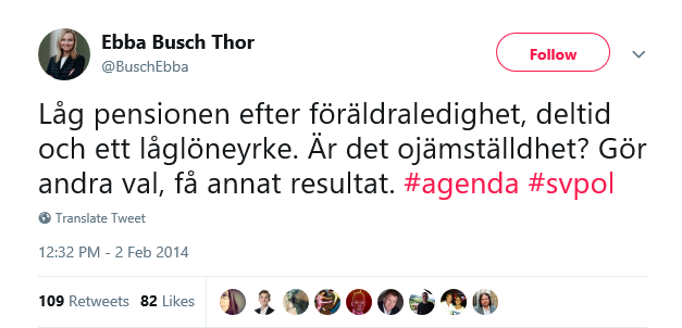 I början av året bubblade en fyra år gammal tweet från KD:s ordförande Ebba Busch Thor upp till ytan och skapade reaktioner. Hon skrev: Låg pension efter föräldraledighet, deltid och ett låglöneyrke. Är det ojämställt? Gör andra val och få andra resultat.
