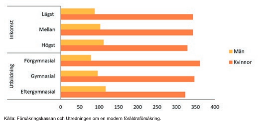 Bland annat Försäkringskassans statistik visar att i de fall som kvinnor tjänar mer än män så tar kvinnorna ändå ut fler föräldrapenningdagar. Men inkomst spelar ändå en roll. Kvinnor med hög inkomst och lång utbildning tar i genomsnitt ut färre föräldrapenningdagar än andra kvinnor, och delar alltså i större utsträckning på ledigheten med sin man.