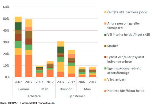 Hon pekar på att det är viktigt att se att orsakerna till deltidsarbete skiljer sig åt mellan yrkesgrupperna. Så väl yrkesområde som arbetsplats är faktorer som spelar roll, säger hon och pekar på att en majoritet av arbetarkvinnor inte jobbar deltid för att de själva valt det.