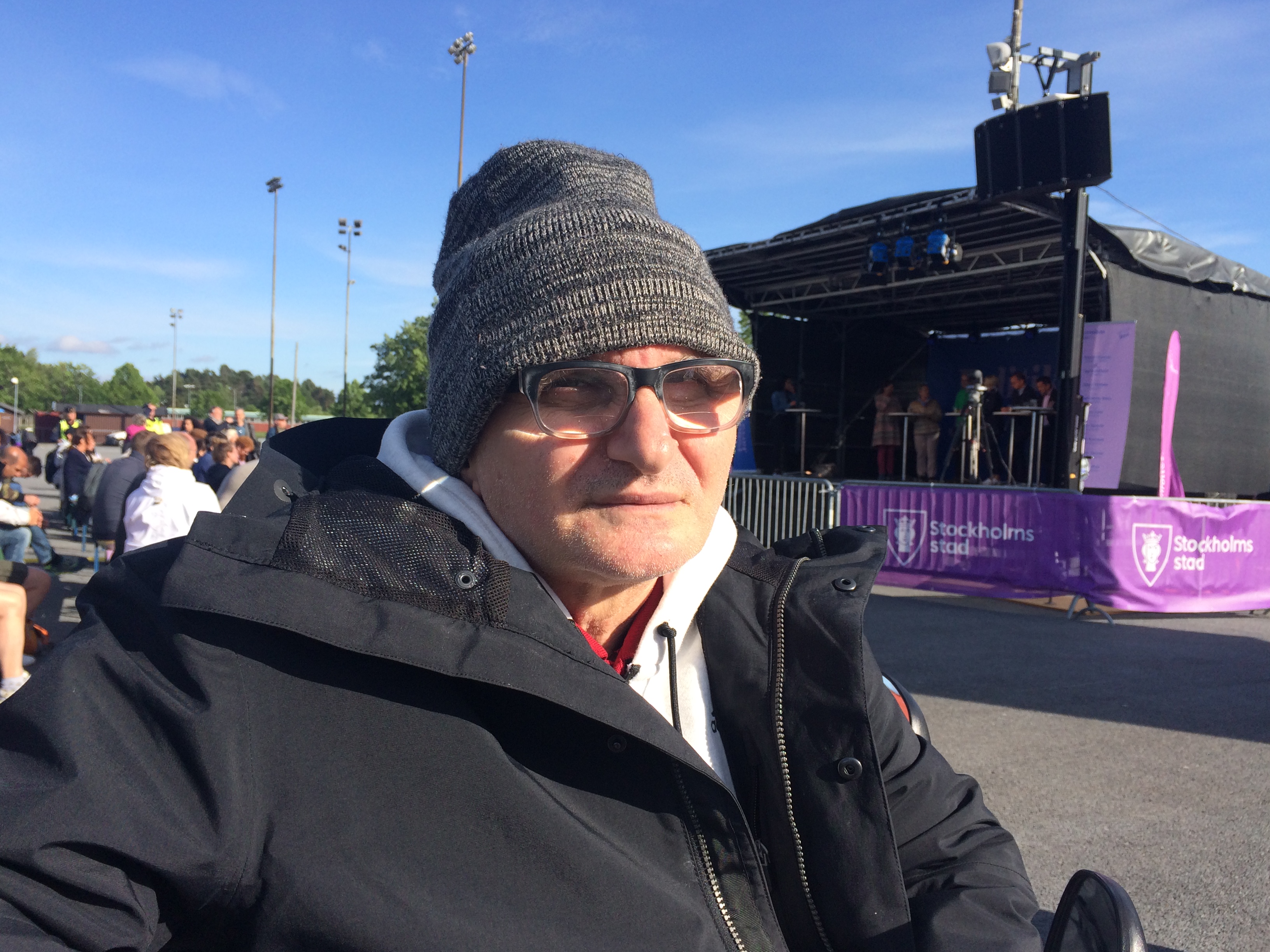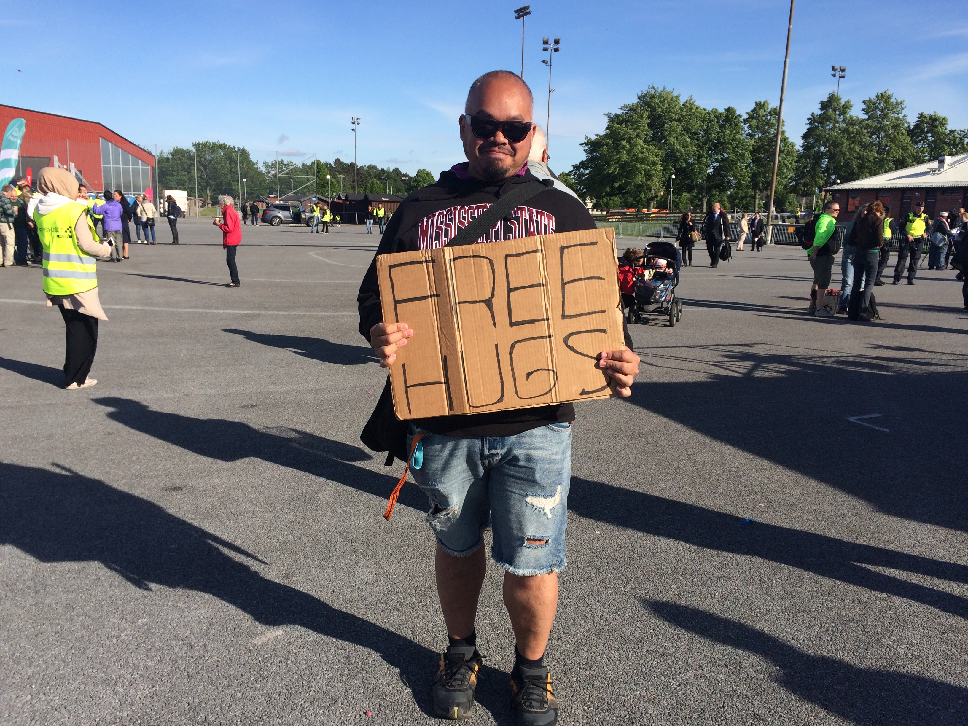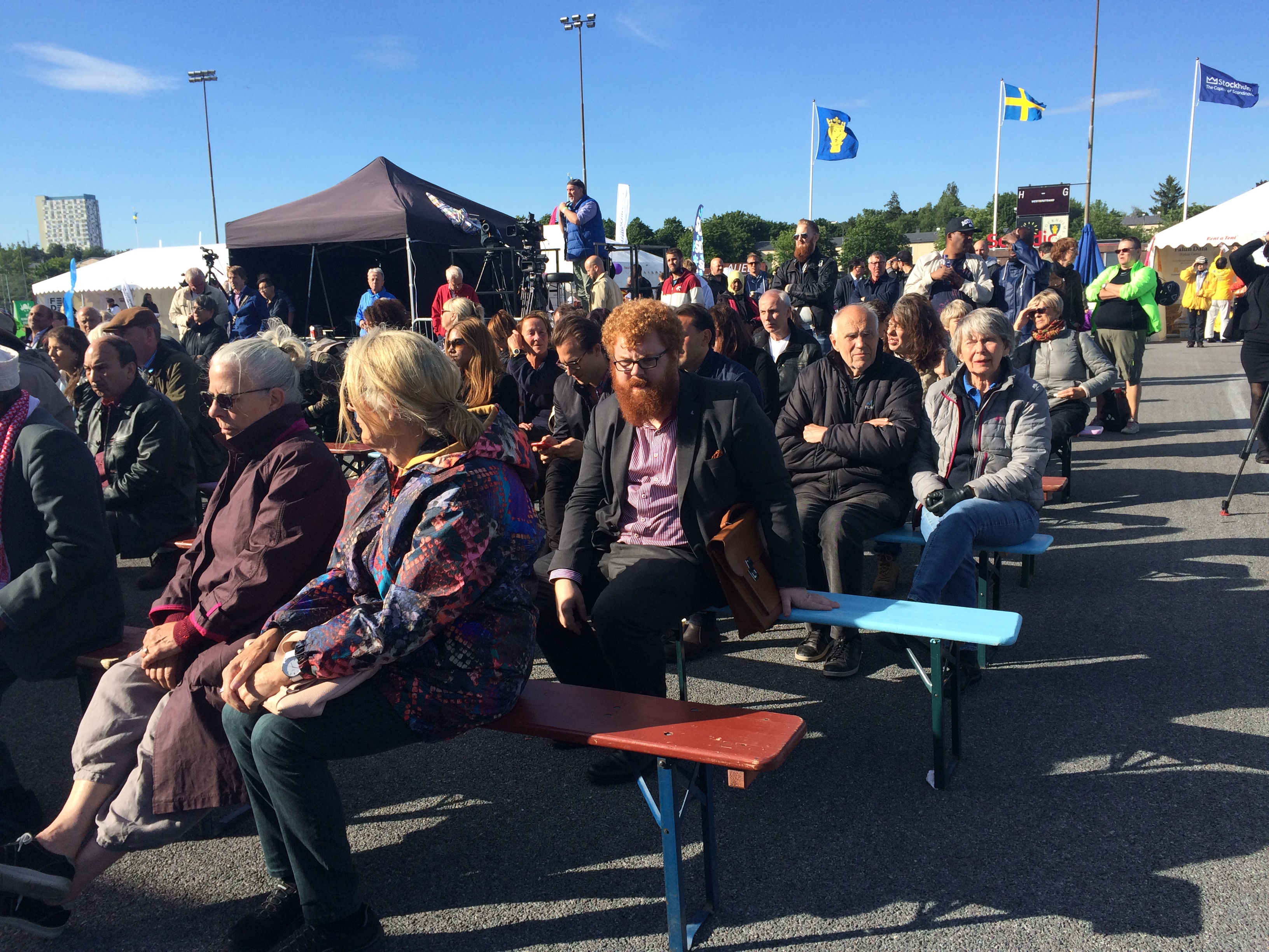 Det är blött på de enkla träbänkarna framför scenen efter ett regn som nyss fallit, och himlen är fortfarande halvgrå. Klockan är nästan fyra och på det inhägnade, asfalterade området på Spånga IP är de få människor som är på plats nästan uteslutande sådana som arbetar på ett eller annat sätt. Som de Fryshuset-anställda ungdomarna med neongula västar, några journalister och, inte minst, de som företräder något politiskt parti eller företag. Många partijackor och ballonger i grälla färger syns kring raderna av små stånd.