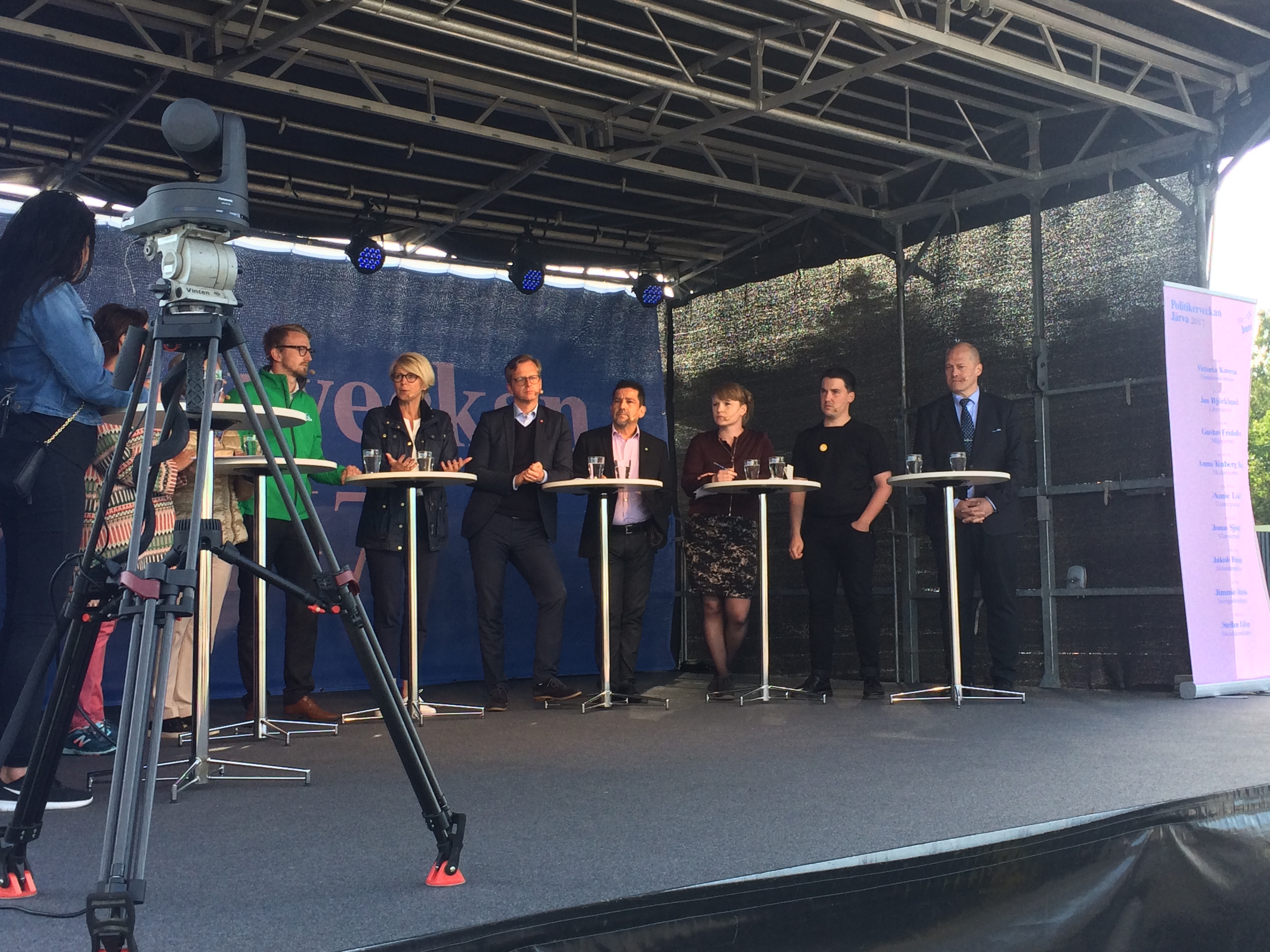 Klockan har blivit fem och det är dags för dagens politikerdebatt. Solen har varit framme ett tag och fler åhörare har samlats framför scenen. Alla riksdagspartier plus Feministiskt initiativ är representerade, med näringsminister Mikael Damberg (S) som det tyngsta namnet.
