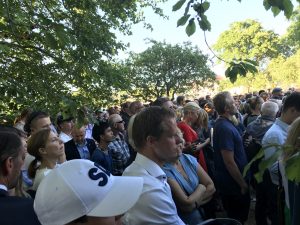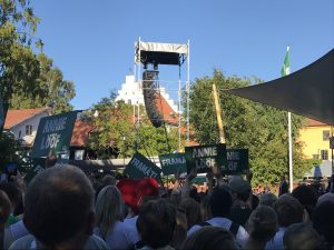 Men allt började med en slags kraftmätning mellan partiledaren på scenen, och en grupp skrikande nazister i folkvhavet som höll upp en banderoll med ordet »folkförrädare«, bara några minuter in i talets inledning som handlade om attacken mot en judisk ungdomsfest. De rasistiska skriken triggade i sin tur både Annie Lööf själv, vars röst vibrerade av ilska, och den stora publiken som skanderade »Annie! Annie! Annie!« och jublade minst ett par gånger innan protesterna tycktes avta.
