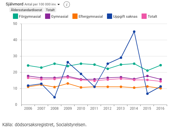Bland personer med högst förgymnasial utbildning verkar den psykiska ohälsan öka och det är nästan 60 procent så vanligt att personer som bara gått klart grundskolan tar sitt liv än de som läst vidare efter gymnasiet, och utvecklingen för lågutbildade går också här åt fel håll.