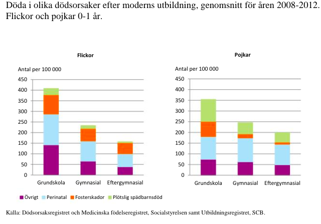 Mellan åren 2008-2012 var dödligheten nästan dubbelt så hög bland flickor 0-1 år vars mammor hade grundskoleutbildning som bland dem vars mammor hade gymnasieutbildning, och närmare tre gånger så hög som bland flickorna som hade eftergymnasialt utbildade mödrar.