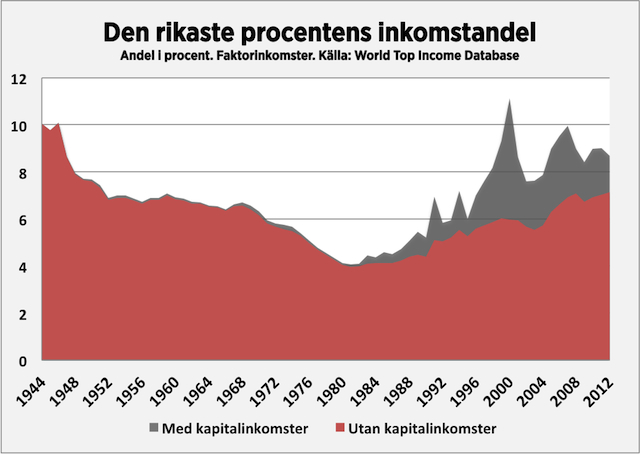 Skiftet har flera orsaker. Löneskillnaderna har visserligen ökat, men toppen har dragit ifrån främst på grund av att de lyckats maxa avkastningen på sitt kapital. Hausse på börsen och annan spekulation har gjort aktieägarna och finanseliten allt tätare.