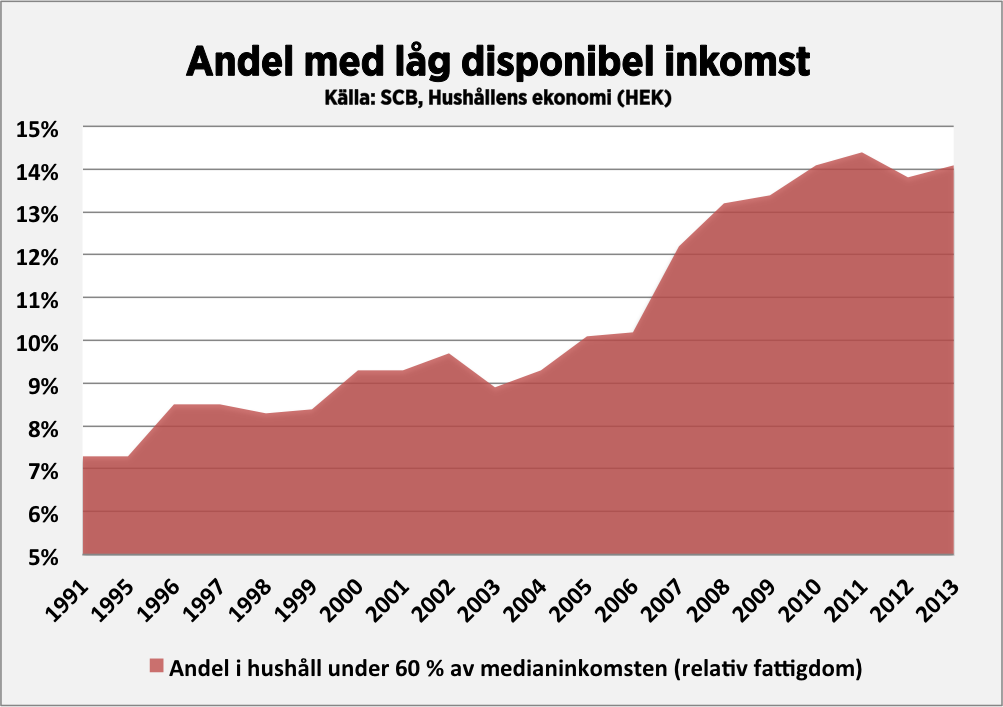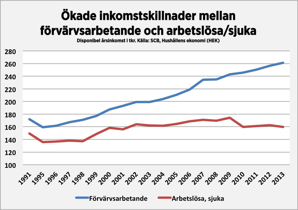 Det beror, förutom den ihållande arbetslösheten, på den tidigare borgerliga regeringens ”arbetslinje”, med jobbskatteavdrag, försämrad a-kassa och utförsäkringar som huvudnummer. En politik som ”avsiktligt och framgångsrikt har lyckats skapa större inkomstskillnader mellan förvärvsarbetande och icke förvärvsarbetande”, som tre nationalekonomer uttryckte det i en rapport till Finanspolitiska rådet 2014. Med högre relativ fattigdom som följd.