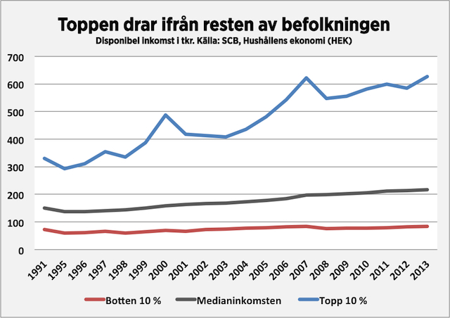 Klyftorna har vuxit rejält mellan 1991 och 2013. Det visar ny statistisk från SCB som Dagens Arena har granskat. Inkomsterna ökade med 90 procent för den översta tiondelen av befolkningen, vilket kan jämföras med medianinkomsten som ökade med 50 procent under samma period. Höginkomsttagarnas bit av inkomstkakan har vuxit från 20 till 25 procent.