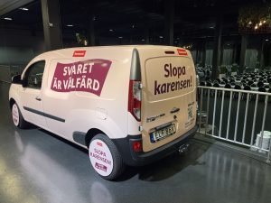 Att det är en viktig fråga för förbundet och deras medlemmar blir tydligt när man vandrar runt i kongresshallen på Svenska Mässan i Göteborg. Utanför restaurangen där kongressombuden äter lunch står en skåpbil draperad med budskapet ”Svaret är välfärd – Slopa karensen” och i talarstolen kan man se folk med T-shirts med samma budskap.