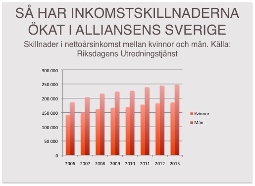 Regeringens politik har gynnat rika män, på bekostnad av fattiga kvinnor. Sedan 2006 har skillnaden i årsinkomst mellan män och kvinnor ökat med 18 241 kronor.