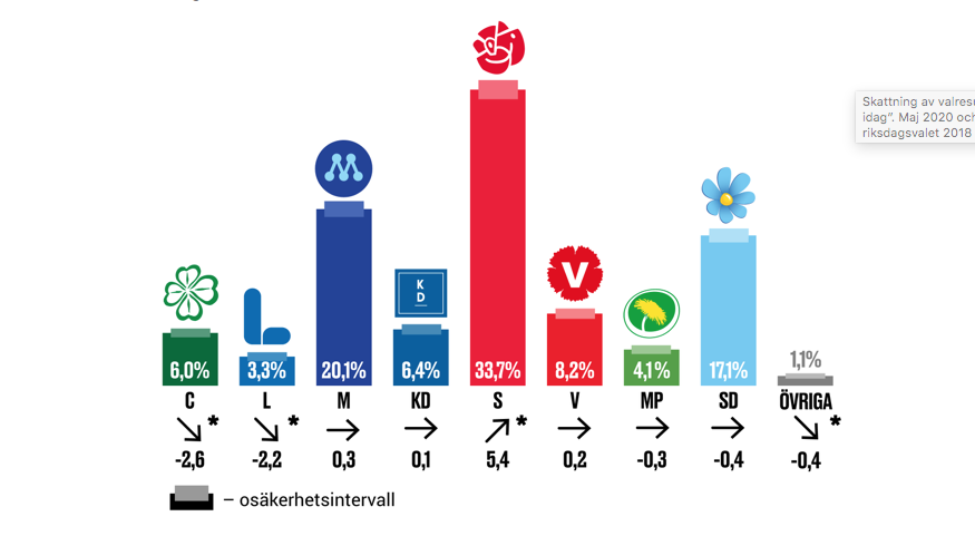 Sverigedemokraterna hade ett riktigt högt resultat i senaste mätningen, i november 2019, då 22,7 procent av väljarna uppgav att de hade röstat på partiet om det varit val i dag. I majmätningen har de bara stöd av 17,1 procent av väljarna, vilket innebär ett tapp med 5,6 procentenheter. Jämför man istället med valresultatet 2018 är tappet under maj 2020 mer blygsamt: 0,4 procentenheter.