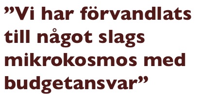 – Vi behöver inte gå in i den ekonomiska frågan. Har alla människor rätt till att vara grundtrygga? Ja, det har man. Då får man betala för det. Vi svarar hela tiden i form av ekonomi. Vi har förvandlats till något slags mikrokosmos med budgetansvar.